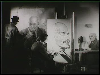Rajzoló grafikusok, plakátokat készítő festők a Dekorációs Nemzeti Vállalatnál (pl. "Éljen a világ proletárjait felszabadító nagy októberi forradalom" felirat, agitatív grafika, Rákosi, Sztálin és Lenin képek készítése (Rákosi Mátyás maga is bent van a műteremben és modellt ül az alkotóknak; látható Bass Tibor 1947-es fotójának festmény-reprodukciója is (Rákosi a búzatáblában) készítés közben). A dekorációk, képek, szövegelemek kiszállítása. Gyárakat díszítő munkások (üzemi csarnok transzparensei, pl. "Szabad ember vagy már, nem elnyomott szolga, hord e jelvényt mert ez becsület és dicsőség dolga" kalászos, vörös csillagos magyar zászló. Rákosi-címer, magyar és szovjet zászlók, Lenin és Sztálin arcképének felhelyezése a "Magyar Acélárugyár R.T." főbejárata fölé.