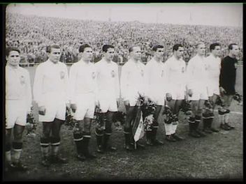Újpest, Megyeri úti stadion, 1949. október 30-a, vasárnap. A himnuszokhoz felsorakozó magyar és bolgár labdarúgók, középen a bíró (Jaroslav Vlcek) és a két partjelző. Dísztribün politikusokkal (Rákosi, Gerő, Farkas, Marosán és mások). Meccsképek magyar gólokkal, fotósok a bolgár hálóőr, Simeon Kostov kapuja mellett. Közönségképek, Szabad Nép reklám.