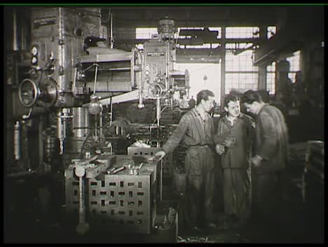 A Ganz Hajógyár gépműhelye (épület külső). Tervtábla a dolgozók nevével ("Büszkeségeink, akik az 1950. évi tervüket idő előtt teljesítették", nevek és a teljesítés ideje). Gerbin László, Prohászka Gyula, Pásztor János és Lopisán András munka közben (műszaki rajz egyeztetése, fúrógép beállítása, fúrás).
