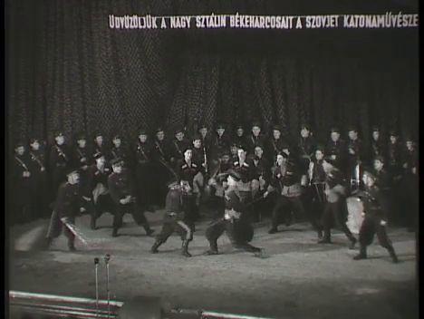 1951. január 17-én szerda este a Városi Színházban lépett fel a Gavrilov-együttes. Az ének- és zenekar előadása (Vano Muradeli Moszkva-Peking c. darabjának részlete hallható) után a tánckar mutatkozik be (Kozáktánc, részlet). Felirat a színpad felett: "Üdvözöljük a nagy Sztálin békeharcosait a szovjet katonaművészeket!"