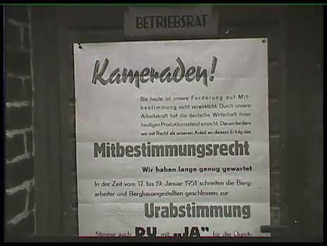 Ruhr-vidék, Mülheim-Heisen, Rosenblumendelle bányatelep, munkaképek (szén tehervagonokba rakodása markolóval, szállítás gőzmozdonnyal). A lakosság tüzelőt gyűjt a bánya közelében (lapátoló idős emberek, gyerekek). Rosenblumendelle 401-es bányája (főbejárat, gyárépületek). A cég munkásai szavaznak a dolgozóknak a termelésirányításba való bevonásáról (a szavazásra felhívó plakát az üzemi bizottság irodájának ajtaján).