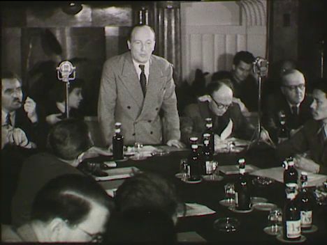 Budapest, Ferihegyi repülőtér, 1951. május 10. csütörtök, az Aeroflot CCCP-L1722-es jastromjelű Li-2-es utasszállító repülőgépe érkezik (Szimonov, a Literaturnaja Gazeta főszerkesztője, valamint Jermilov irodalomtörténész, Zaszlavszkij, a Pravda képviselője és V. Gromek szállnak ki a gépből, a Mihályfi Ernő vezette magyar küldöttség fogadja őket). A Végrehajtó Bizottság ülésén Jean Maurice Hermann, a Szövetség elnöke tart megnyitó beszédet. A tanácskozás résztvevői között láthatók kínai újságírók, Josef Kowalczyk lengyel küldött, Ralph Parker angol újságíró, Desemond Buckle dél-afrikai újságíró. Jiri Hronek főtitkár beszámol a Szövetség munkájáról. A tanácskozáson részt vevő magyar delegáció: Harustyák József, Benke Valéria, Barcs Sándor (MTI vezérig.), Betlen Oszkár (Szabad Nép szerk.), Dezséri László (evangélikus püspök), Komját Irén (Újságíró Főiskola). Derek Kartun, a londoni Daily Worker szerkesztője a résztvevők között. Értelmiségi nagygyűlés a Zeneakadémia nagytermében 1951. május 11-én, pénteken az Országos Béketanács, a Magyar Újságírók Országos Szövetsége és a Magyar Írók Szövetsége szervezésében (Szimonov, majd Desmond Buckle felszólalása, tapsoló közönség).
