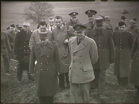 Eisenhower tábornok francia és angol katonatisztek társaságában terepszemlét tart (a küldöttséget fotósok kísérik) Robbanó és beomló híd. "E. Fhörster Waffenfabrik" felirat egy gyárépületen Solingenben. Fegyveralkatrészek. Az amerikai katonai rendészet emberei egy Nyugat-német városban (egyenruha, CG feliratú sisak). Háborúellenes, újrafegyverkezés elleni plakát (Halle városában?). Békegyűlés, felszólaló férfi előadók (Bamberg?, Nürnberg?).