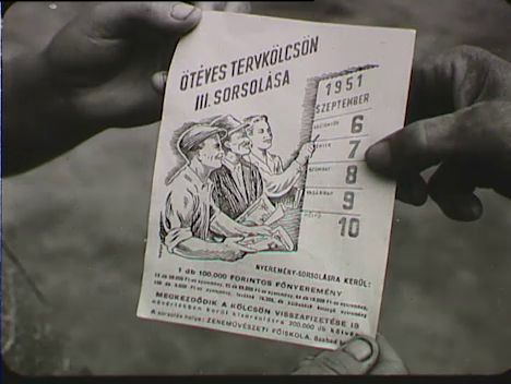 HA-POE lajstromjelű Po-2-es repülőgép a levegőben, röplapokat szórnak róla egy település felett. A Szabo9lcs-Szatmár-Bereg megyei Nyírkércs település, falusi utca, parasztházak, gyerekek és felnőttek kapkodják össze a lehullott szórólapokat. Az egyik szórólap közelképe ("Ötéves tervkölcsön III. sorsolása 1951. szeptember 6-10."). Beszélgető asszony és bajuszos férfiak. Csoma István és felesége gyermekeik társaságában házuk udvarán (léckerítés, sámlik, ajándékok kibontása (nagyanyja segítségével zakót felpróbáló, mosolygó fiú), nevető szülők.