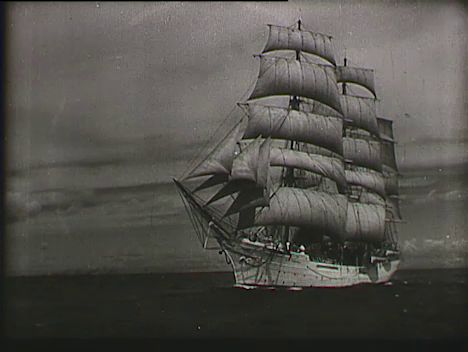 A Dar Pomorza (Pomeránia ajándéka) vitorlás hajó a tengeren. A Lengyel Kereskedelmi Flotta növendék tisztjeinek élete a hajón (vízből mentési gyakorlat, fedélzettisztítás, a szextáns használata, vitorlabontás). Naplemente, előtérben a tenger hullámaival.