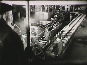 Hengersori munkaképek a csepeli Rákosi Művek csőgyárában (hengerelt anyag méretellenőrzése tolómérővel, az egyik hengerész fején házilag készített védőfelszerelés (kopott kalapból készült "maszk" rajta vágott két lyukkal a szemek számára ezt húzza az arca elé a férfi, miközben a kemencében lévő anyaggal dolgozik). Csőgyártó gépsor és kezelőszemélyzet munkája. A csőgyártó üzemben elkészült munkadarabok raktározása a gyár udvarán (anyagmozgatás sínpályán mozgó daruval).