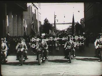 A LUnitá Sajtófesztivál záróünnepsége Bolognában, utcaképek, felvonulás (rendőrmotorosok vezetik a felvonulók tömegeit, a rendezvény reklámfelirata: "Festival Nazionale de LUnita, Parco della Montagnola, 18-24 settembre", transzparensek: FGCI (Olasz Kommunista Fiatalok Szövetsége), Sztálin arcképe). Palmiro Togliatti a díszvendégek között, majd arcképe egy transzparensen.