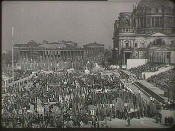 1952. május 1-i felvonulás Kelet-Berlinben, a Marx-Engels Forum-on (panorámakép a térről, hatalmas tömeg, háttérben a Dóm épülete). Pieck beszéde (részben eredeti hang). Az elnöki emelvény előtt elvonuló tömeg képei (integető, mosolygó, tapsoló emberek, háborúellenes transzparensek, a nyugati államok vezetőit kigúnyoló "maszkos alakoskodók" (pl. amerikai, angol, indiai jelmezben).