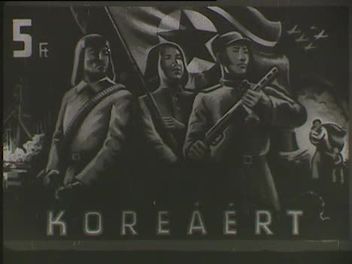 Pillanatképek a koreai háborúból (támadó gyalogos katonák, amerikai vadászrepülő a levegőben, kilőtt amerikai harckocsik, halott katonák. Fegyvergyártás (automata gépek, összeszerelő üzem (kézifegyverek, töltények készítése, dolgozó munkások, munkásnők). Kiállítás Phenjanban az Észak-Koreának juttatott baráti ajándékokból (textíliák, ruhaneműk, konzervek, forgácsológépek, Wilhelm Pieck arcképe a kiállításon sétáló, mosolygó látogatók). Budapest, a Parlament képe, előtérben a Kossuth-híddal. Bélyeggyártás az Állami Nyomdában (A3-as íveket nyomó nyomdagép, közelkép a Koreáért elnevezésű, 5 forintos névértékű bélyegről).