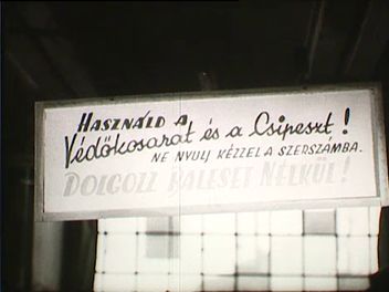 Munkavédelmi tábla felirata a Beloiannisz Híradástechnikai Gyár (Budapest, 11. ker. Fehérvári út 70.) egyik üzemében ("Védő szemüveg használata kötelező! szemüveg a szerszámtárban.") Köszörűkorongok eléjük fordítható szemvédő pajzzsal. Marógép, felszerelve védőszerkezettel (dolgozó forgácsoló szakmunkások). Táblafelirat egy műhelyben ("Használd a Védőkosarat és a Csipeszt! Ne nyulj kézzel a szerszámba. Dolgozz baleset nélkül!"). Védőkosárral és oldalráccsal felszerelt présgépeknél dolgozó munkásnők. Védőrácsos présgépnél dolgozó munkásnők az ELZETT Vasárugyár műhelyében (Budapest, 13. ker. Bencze u.). Lendkerekek, szíjak beburkolása. Üzemorvosi rendelő a gyárban (páciensek, vizsgálatot végző doktornő (speciális orvosi műszer használata, védőszemüveg tesztelése erős lámpafényben).