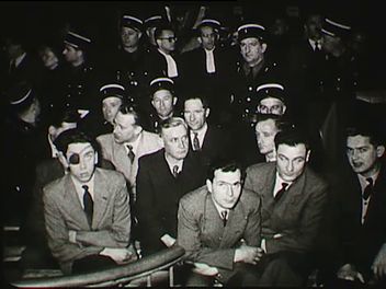 Oradour sur Glane település romjai (utcaképek, megrongált, kiégett épületek, templom, helységnévtábla, az 1944. jún. 10-i mészárlásra emlékező gyászolók a helyi temetőben, egy jelképes sírnál. Az esethez kapcsolódó háborús bűnösök pere Bordeaux-ban (városi utcák, a bíróság épülete, tárgyalóterem, ügyvédek, katonai vezetők, polgári lakosság; fényképek az elkövetőkről: fiatal német férfiak civilben, körülöttük egyenruhás francia rendőrök). Háborúellenes tüntetés a párizsi Champs-Élysées-en (metrómegálló Metropolitain táblafelirattal, felvonuló francia veteránok (többen csíkos rabruhában, mellükön kitüntetésekkel), transzparensekkel (a Krupp-vállalat és a hadiipari beruházások ellen).