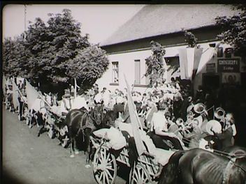 Búzaföldek panorámaképe Vaskút (Bács-Kiskun megye) határában. Aratás géppel és kézi eszközökkel (kombájn, kaszáló bajuszos férfi, mögötte markot szedő nő; kaszát fenő férfi, az égen galambok repülnek. Cséplés helyi tsz-ben (traktor, cséplőgép, lovas szekereken érkező kévék, a háttérben kazal, mázsálás, a cséplés dokumentálása, zsákok). Aratóünnep a községben (a beszolgáltatásra érkező, feldíszített lovas szekerek, játszó fúvószenekar, zsákok behordása az átvevőhelyre, táncoló, iszogató helyi lakosok az utcán (néptánc: páros tánc, asszonyok körtánca).