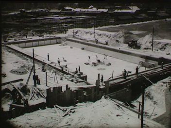 A Lokomotív Sport Egyesület Szőnyi úti sporttelepének építése Zuglóban (ma: BVSC-Zugló, Budapesti Vasutas Sport Club-Zugló Közhasznú Egyesület, Szőnyi út 2.). A műugró medence és az úszómedence egymás mellett. A versenyuszoda medencéjén dolgozó kőművesek és más betanított- és szakmunkások (kutat ásó markológép, a medencét söprő, betont keverő diákok slaggal locsolják egymást a tűző napon, víz alatti filmfelvételek készítésére alkalmas kémlelőablak építése a medence egyik falában, a medencepart burkolása mozaik kövekkel, rajtkövek elhelyezése).