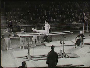 Ízelítő képek a Sportcsarnokban rendezett országos mesterfokú tornászbajnokság férfi és női számainak versenyeiből 1953. október 31-november 1-én (szombat és vasárnap). Köteles Erzsébet (Gulyás Károlyné; Reviczky Jánosné) gyakorlata a felemás korláton (közönségképek, edző, versenybírók, Rákosi-címer a tornacsarnok bejárata feletti falon). Sántha Lajos a nyújtón. Kocsis Károly korlátgyakorlata. Pataki Ferenc lóugrása (egymás mellett ülő pontozóbírók figyelik a gyakorlatot). Keleti Ágnes talajtorna gyakorlata (közönségképek, gyakorlata végén Keleti mosolyogva integet a kamerának).