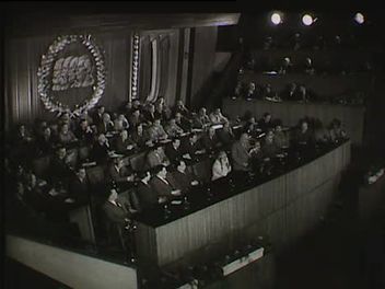 A MÉMOSZ székház vörös csillaggal a tetején. Küldöttek: Lukács György. Mekis József beszél. Tapsoló elnökség: Rákosi Mátyás, Nagy Imre, Gerő Ernő az első sorban. Tapsoló küldöttek. Rákosi Mátyás beszédet olvas fel. Küldöttek. Az ülésterem. A beszéd végén felállva tapsolnak a küldöttek. Az elnöki asztalnál Farkas Mihály is tapsol. (zene - Internacionálé)