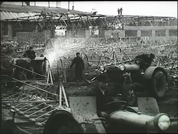 HSCS traktorok haladnak egy törökszentmiklósi utcán, majd bekanyarodnak gépgyár udvarára. Lóvontatású gereblyék, gépi kukoricamorzsolók, kultivátorok készülnek a műhelyben. Szállításhoz készítik az elkészült gépeket az udvaron.