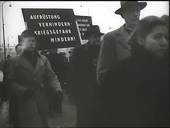 A hamburgi polgárokat tüntetésre hívó röplap. Munkások az utcán, röpcédulákat osztó fiú. Munkások egy gyár kapuja előtt. "Soha többet!" feliratú tiltakozó plakát. Féllábú ember mankóval. Felvonulás Münchenben, transzparensek.