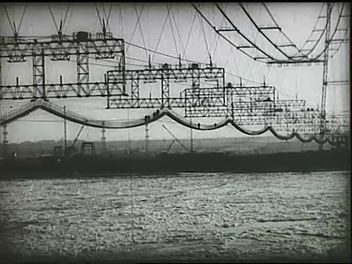 Úszó jégtáblák a Volgán. Férfi mászik egy kötéllétrán. Munkások a függőhíd szerelése közben. Villanyvezetékek a folyó felett (totál).