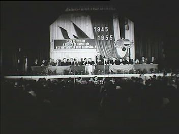 Feldíszített színpad a Magyar-Szovjet Társaság ünnepségén a Vasas székház dísztermében 1955. június 9-én (totál). Tapsoló közönség. Erdei Ferenc mond beszédet. Jurij Andropov, majd Vlagyimir Georgijevics Jakovlev, a VOKSZ (Kulturális Külkapcsolatok Összövetségi Társasága) elnökhelyettese beszél. Veres Péter az elnökségi asztalnál. Leleplezik a Lenin portrét a színpadon. A vendégek között Pór Bertalan festő. Tapsoló közönség.