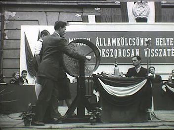 Kicsiny házacska Mecsekszabolcson. Ezt nyerte a békekölcsön tavalyi sorsolásán Novák Ferenc vájár és felesége. Az ötvenezer forintos nyereményből még gyümölcsösre is telt. Berecz Istvánék a bútorokat köszönhetik a békekölcsönnek. A 25 ezer forintos nyereményből gramofont és varrógépet is vásároltak. Az Újpesti Közért egyik kiszolgálója Homolya bácsi. A tavasszal nyert 50 ezer forintból házat fog építeni lányának. És most Egerbe látogattunk el, ahol megtartották a negyedik békekölcsön harmadik sorsolását. A Pedagógiai Főiskola udvarán ismét forog a kerék. Ezúttal is sokan kerülnek a szerencsés nyerők boldog névsorába. Az eddigi sorsolásokon államunk 1 milliárd 873 millió 136 ezer forintot fizetett vissza. Ha ezt a pénzt egymás után raknánk, a százasok Budapesttől Tibetig érnének.