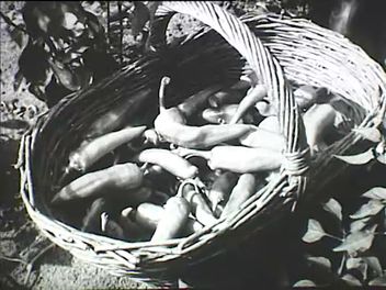 Paprika a szántóföldön (közeli). Szedik a paprikát a röszkei Lenin Termelőszövetkezet ültetvényén (nagytotál, svenk). Paprikaszedő asszony kosárba gyűjti a növényt (közeli). A kosarakból zsákokba töltik a paprikát. Paprikafűző asszonyok (közeli). Paprikaszárító helyiség.
