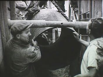 Az Újpesti vasúti híd lábánál nagy átmérőjű csöveket fektetnek le autódaru segítségével (svenk). A sofőr az autódaru vezetőfülkéjében. A cső a földbe kerül. Hegesztő munkások (közeli).
