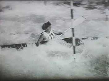 Kajakosok a vízben Tacennél, a Száva folyó sebes szakaszán, a Kajak Szlalom-világbajnokságon. Nézők a parton. A cél felirat egy hídon. Az egyéni győztesek: Rosemarie Biesinger és Sigfried Holzbauer. Taps. A csehszlovák csapat kapitánya átveszi a kupát.