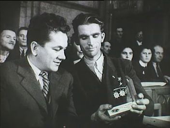 A Parlament kupolája (külső). A kongresszusi terem ablakai (belső). A tanácskozásra összegyűlt emberek a széksorokban tapsolnak (totál). Közeli képek a jelenlévőkről. Magyari András miniszter helyettes mond beszédet. Dobi István kitüntetéseket ad át (közeli). Csányi Mihály átveszi a díjat, majd megmutatja azt. A kitűntetés (közeli).