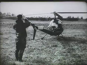 Az Aero HC-2 (VR-2) típusú csehszlovák helikopter száll le egy szántóföldön. A pilóta elhagyja a gépet, majd megvizsgálja a rotort. A műszerfal (közeli). Kurbli segítségével beindítják a motort, majd felszáll a gép (közeli).