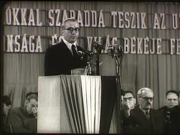 Dísztribün a Sportcsarnokban. Andics Erzsébet a szószéken. Hallgatóság. Tapsolnak. Péter János felolvas. Jánosi Ferenc felolvas. Bugán Jánosné felolvas. Taps.