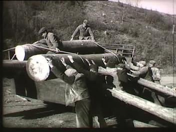 Favágók motoros fűrésszel. Rönköket húznak fel egy teherautóra. Indulnak a teherautók. Motoros fűrésszel fát aprítanak. Sínautóval gurítják le a felaprított fát a hegyről.