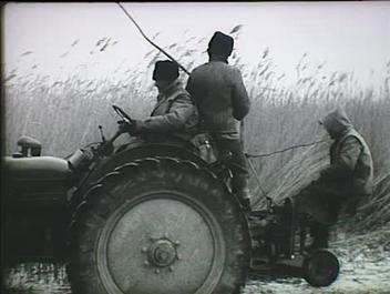 Zetor traktor halad a nádas mellett, arról vágják a nádat. Összegyűjtik a kévéket és egy lovas szánkóra rakják.