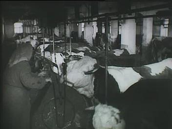Egy mezőgazdasági épület, belül egy férfi szénát rak vasvillával. Kis függővasútban a takarmány, onnan esznek a tehenek. Kaparórács továbbítja a trágyát.