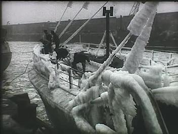 Fagyott tenger, a jég között egy nagy hajó. Halászhajót vastag jégréteg borítja. Eltávolítják a jégpáncélt.