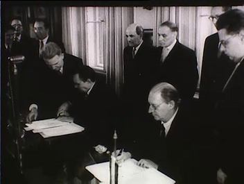 Cigarettázó tudósok könyveket lapozgatnak. Műszerek. Jánossy Lajos egy műszert vizsgál. Tudósok félkörben, köztük Rusznyák István. Az aláírás. Rusznyák István koccint valakivel, hátul Jánossy mosolyog.