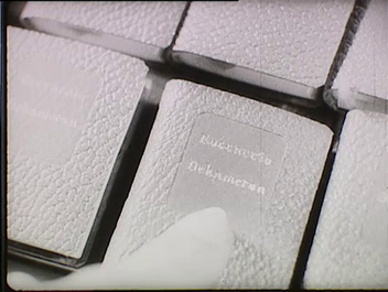 Könyvesboltban: a polcokon apró méretű könyvek. Vásárló nézegeti, majd fizet.