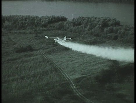 Felszálló repülőgép. DDT-s zsákok. Rovarölőt töltenek a repülőgépbe. Megbeszélés felszállás előtt. Repülőgép a Duna felett. Permetező repülőgép. A pilóta. Ismét a DDT-t szóró repülőgép.