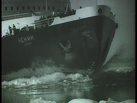 A Lenin jégtörő közelít a vízen. Közeli kép, ahogy töri a jeget, majd távoli, ahogyan a jégtáblák között halad. A vezérlőterem. Radarok a hajón. Hajókaraván a jégtörő mögött.