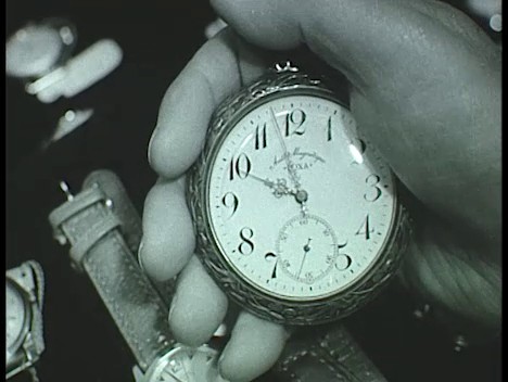 Zsebóra. Üzletbelső. Két eladónő beállítja az órákat. Pultok, órák, vásárlók. Doxa órák. Naptár óra és ébresztő karóra közelről.