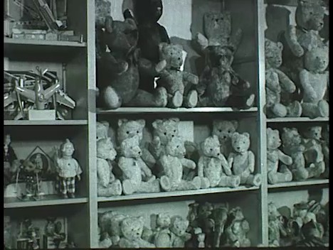 Játékbolt, játékokkal teli polcok. Gyerekek próbálják ki a játékokat: autót, hajót, síelő mackót, hintalovat, lendkerekes repülőt, hegyi vasutat. Síró kislány. Mozgó fajátékok. Hibás játék. Ismét a síró kislány.
