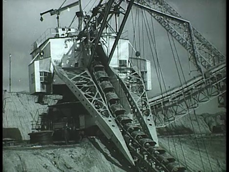 A Sztrizsevszkij külszíni szénbányában kipróbálják az óriás szállító- és rakodógépet. A markoló rész. Az irányító torony a diszpécserrel. A földhordó szállítószalag és a daru fölülről nézve. Totál az egész gépről.