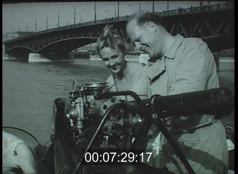Motorcsónakverseny Budapesten a Dunán. Az NDK versenyzőnője győz.