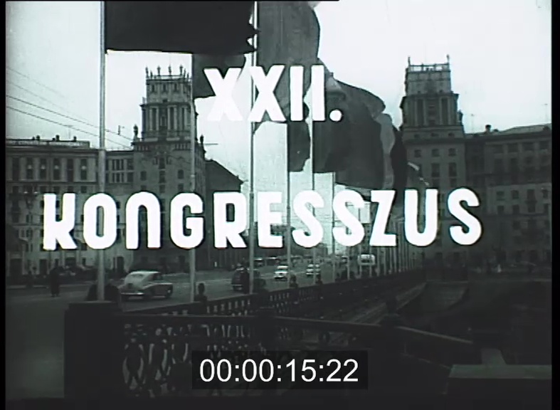 Kreml: Kongresszusi Palota, újságok címoldalai, Hruscsov hat órás beszéde a programtervezetről, Mikoján a pártellenes csoportokról, Hruscsov kukoricacsöveket mutat fel, Csu-En-laj KKP aleln. üdvözli a kongresszust, Gomulka, Thorez, Kádár János üdvözlő beszédei, hosszú taps állva.