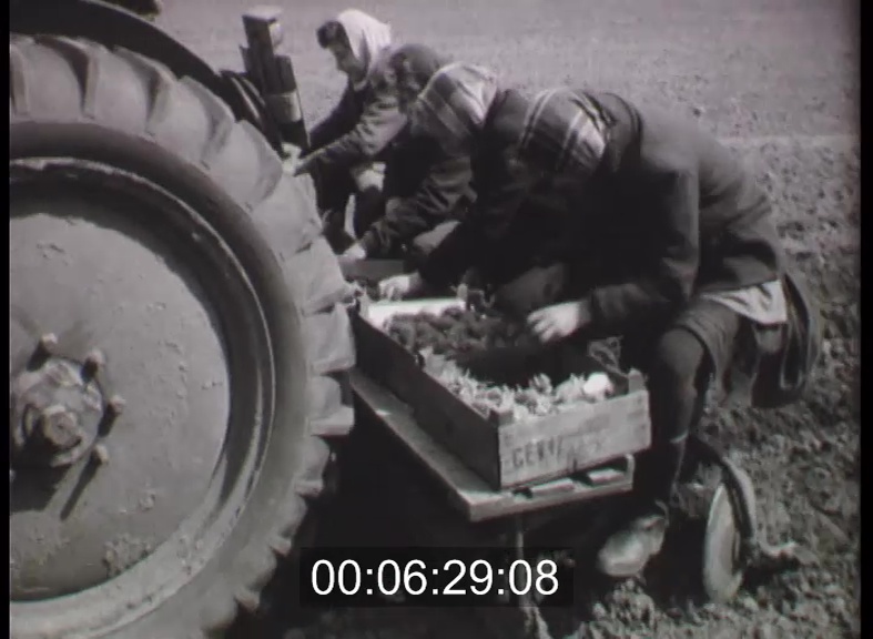 Burgonya vetése Zetor 25K traktorral. Talajlazítás lókapával. Szőlőt kapáló asszonyok. Szántás, boronálás képei. Inárcs, a tsz. vezetői térképen magyarázzák a hátralevő tennivalókat. Éjszakai szántás a földeken.