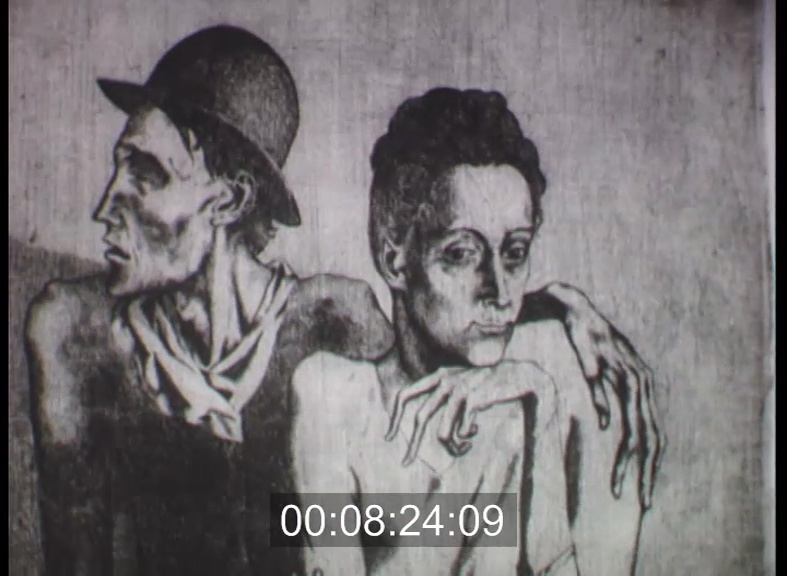 A Szépművészeti Múzeum kiállítása. Néhány grafika közelről: Daumier néhány gúnyrajza. Manet: Polgárháború 1871, Toulouse-Lautrec: Írek és amerikaiak a bárban, Stenlein: A beteg gyermek (rézkarc), Renoir: Fürdőző, és Gauguin: Bretaigne-i emlék. Érdeklődők Picasso képeit nézik. Picasso "A vak" című, 1904-es rézkarca, és a kötéltáncosok életét ábrázoló grafika.