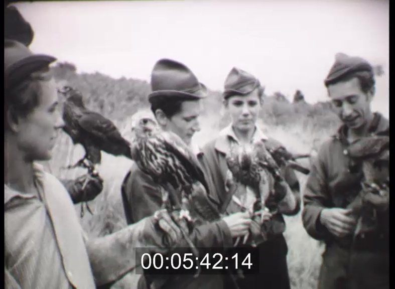 Solymászok terepen. Egy sólyom közelről. A klubtagok. Röptetés. Galambot zsákmányol a sólyom. Nyulat fog a vadászhéja, majd gazdája kezére száll vissza.
