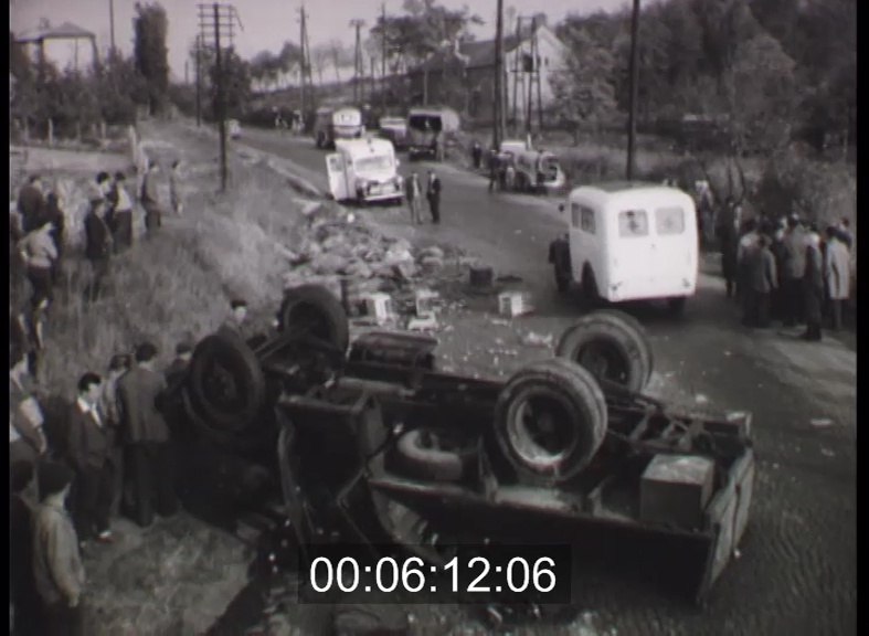 Lehullott zsákok, ládák, szétgurult áru a Budaörsi úton. Bámészkodó emberek. A felborult teherautó. Szirénázó mentőautó hagyja el a baleset színhelyét.