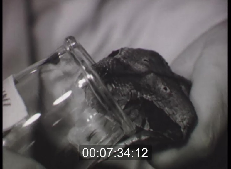 Kobrák a pálmaházban. Janich Miklós zoológus megragadja az egyiket és lecsapolja a mérget. Másik kígyó mérgének lecsapolása. Janich közelről. A kígyó feje közelről, amint mérget vesznek tőle.
