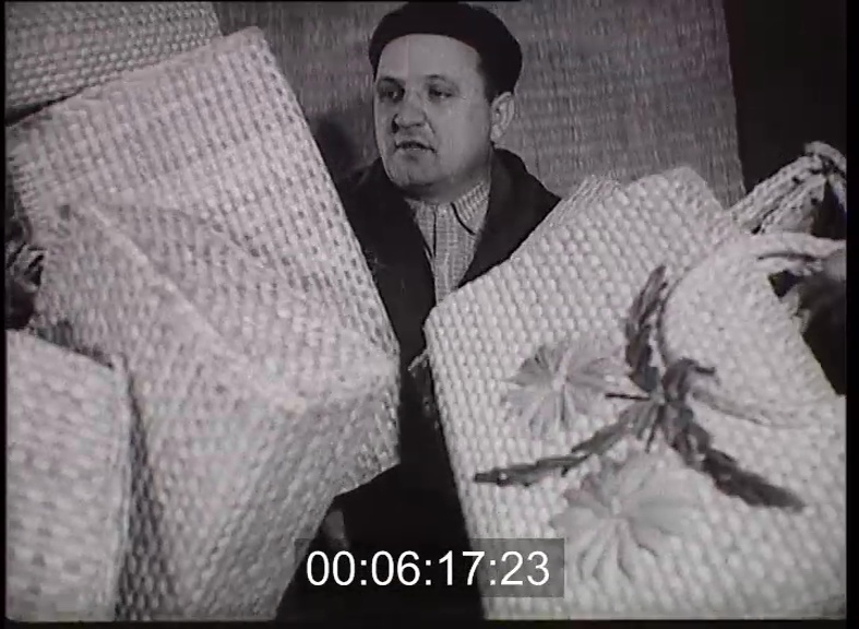 Kosárhalom mögött végzi munkáját a minőségellenőr. Gyékényt fonó asszonyok, fiatalok.