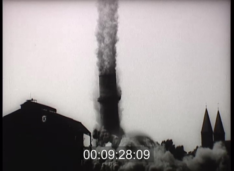 Ezt a 120 méter magas kéményt lebontásra ítélték az NSZK egyik városában, Duisburgban. A robbantást nagy körültekintéssel kellett előkészíteni a lakott területen. Elérkezett a pillanat, heves detonáció rázta torony méltóságteljesen aláomlott. Csak törmelék és por maradt utána, mely hirtelen kavargással még a napot is elhomályosította.